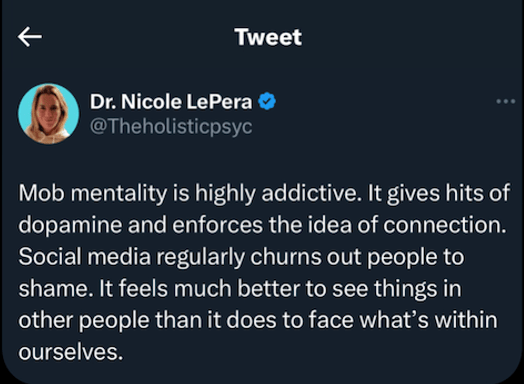 Dr. Nicole LePera (@Theholisticpsyc) connects the effects of social media to mob mentality. A recent Tweet of hers caught my attention: